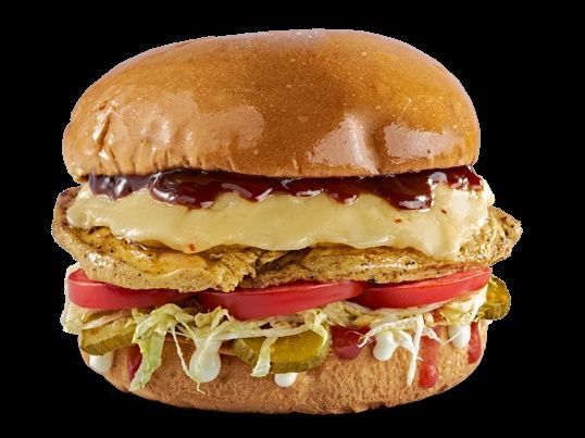 Crispy chicken breasts with cheddar sauce, tomatoes, mayonnaise, ketchup, lettuce, pickled cucumber.