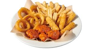 Crispy chicken pieces with cheese sauce, ketchup, mayonnaise. Served with potatoes